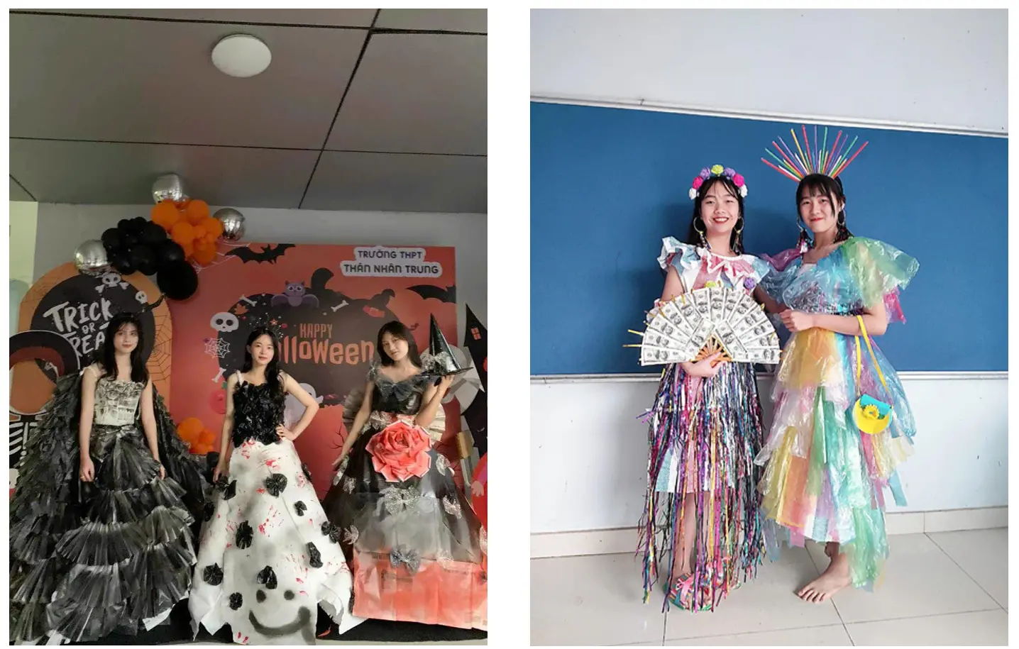 Một số trang phục làm từ giấy báo cũ, túi nilong