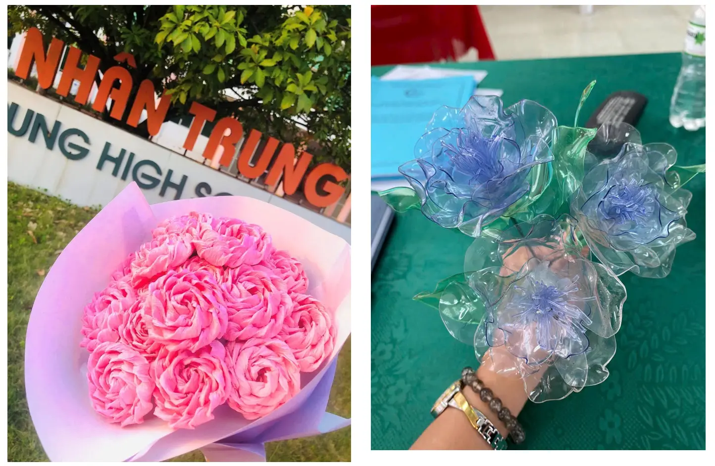 Từ những vật liệu tái chế như giấy vụn, chai nhựa, vải thừa, lõi giấy…, học sinh nhà trường còn sáng tạo nên những bông hoa thủ công độc đáo, mang giá trị thẩm mỹ cao. Các sản phẩm hoa tái chế này được trưng bày, giới thiệu và bán gây quỹ thiện nguyện, nhằm ủng hộ học sinh có hoàn cảnh khó khăn và các hoạt động nhân ái trong và ngoài nhà trường. Hoạt động không chỉ góp phần nâng cao ý thức tái chế, tiết kiệm tài nguyên mà còn bồi dưỡng cho học sinh tinh thần sẻ chia, trách nhiệm với cộng đồng, lan tỏa thông điệp “rác thải hôm nay – yêu thương ngày mai”.